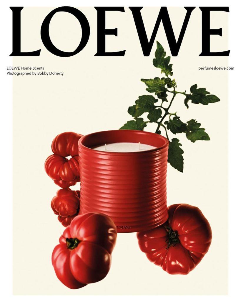Tra le fragranze più iconiche spicca la candela alla foglia di pomodoro, fresca e acidula, riflesso perfetto del legame profondo che Loewe intrattiene con questo frutto. Non a caso, il pomodoro cuore di bue — carnoso e quasi barocco nelle forme — era stato definito “molto Loewe” in un tweet diventato virale. Un dettaglio che la maison ha saputo trasformare in leva comunicativa, dando vita a un’intera serie di accessori ispirati al pomodoro. Ulteriore prova che, in Loewe, l’universo olfattivo non resta confinato ma contamina tutti i linguaggi creativi.