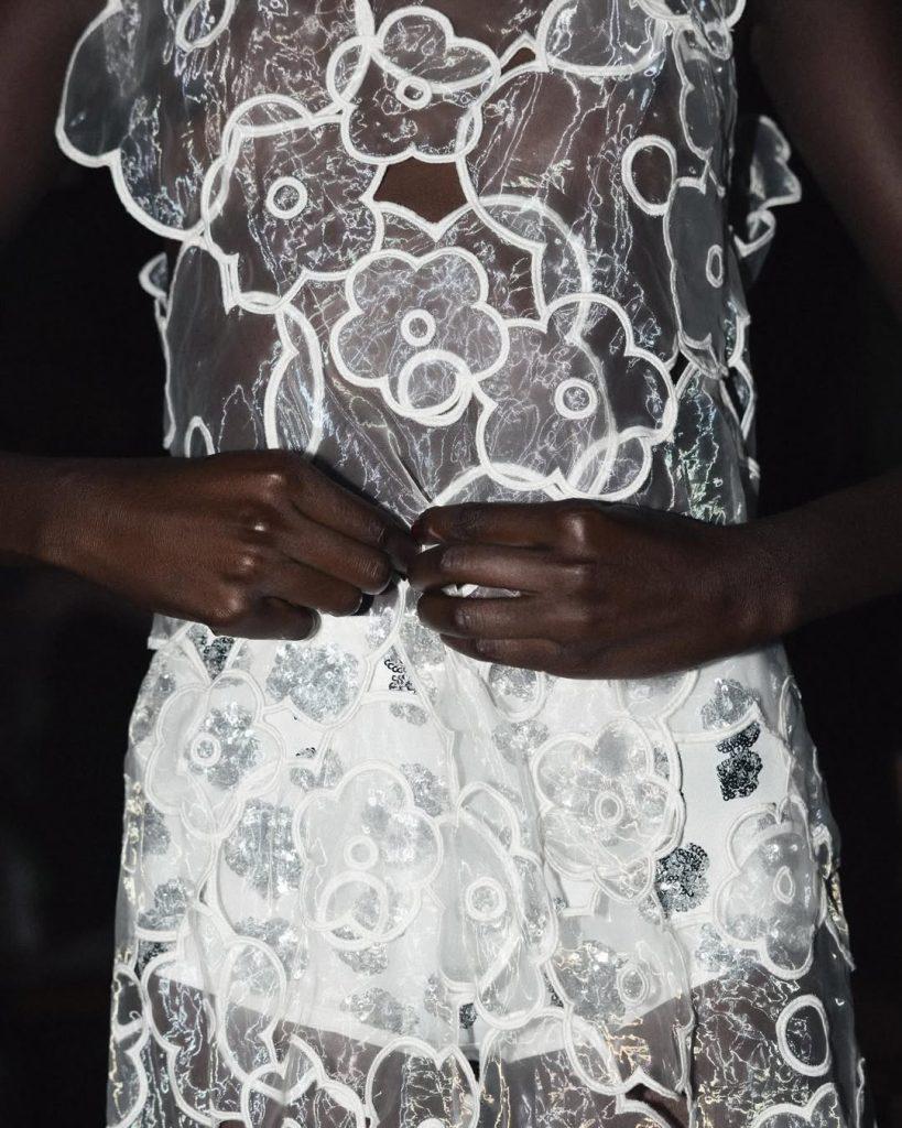 Il messaggio di questa collezione anniversario è chiaro: Cecile Bahnsen si esprime attraverso la delicatezza romantica che l’ha proiettata sulla scena internazionale. Gli abiti “meringa” dai volumi aerei sono realizzati con tessuti trasparenti, lasciando intravedere shorty di paillettes, in un delicato equilibrio tra pudore e sensualità. Sovrapposizioni, asimmetrie studiate e strascichi che prolungano anche gli abiti più corti creano silhouette in continuo movimento. I motivi floreali, emblema della maison, tornano protagonisti, assemblati come frammenti di tessuto in un collage organico. La ricerca dei volumi prosegue con volant vaporosi che avvolgono i bordi di abiti ora mini, ora lunghissimi. Una gonna strutturata evoca una crisalide, metafora di una metamorfosi estetica, mentre una sottoveste in seta viene ripensata in versione amplificata, affermando una firma visiva ormai inconfondibile. In questa visione della moda, la couture si vive ogni giorno, con una poesia dell’estremo, fragile, precisa e profondamente personale.