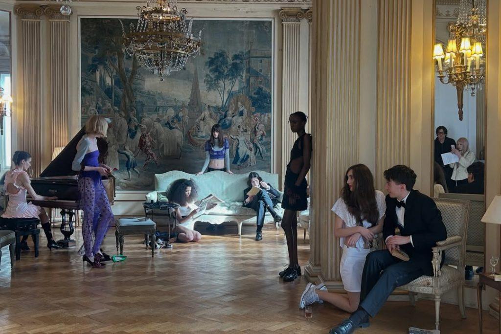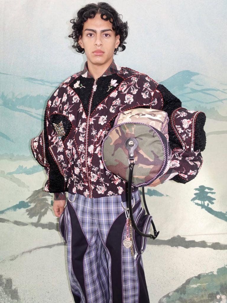 Quanto a Conner Ives, stilista americano basato a Londra, ha aperto la sua sfilata con Tish Weinstock. Il casting inclusivo e trasversale riflette la volontà di portare in passerella personalità distinte, anziché silhouette standardizzate. La collezione trasporta lo spettatore in un’altra epoca, in una Germania profondamente trasformata. Sullo sfondo si intravede un parallelo con gli Stati Uniti, paese d’origine dello stesso Ives. Un modo per denunciare e al tempo stesso intercettare l’energia di un periodo di transizione, complesso e inquieto. Lo slogan “Glamour to subdue the dread” sintetizza l’intento: sublimare per contenere l’angoscia. Restano impressi i foulard annodati sui fianchi, la fluidità delle silhouette, la disinvoltura studiata e i ricami floreali e ornitologici che sembrano sospendere il tempo.