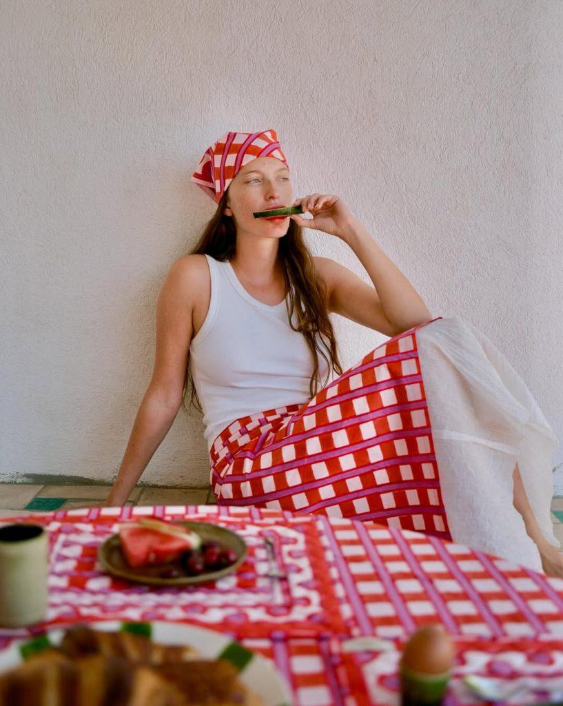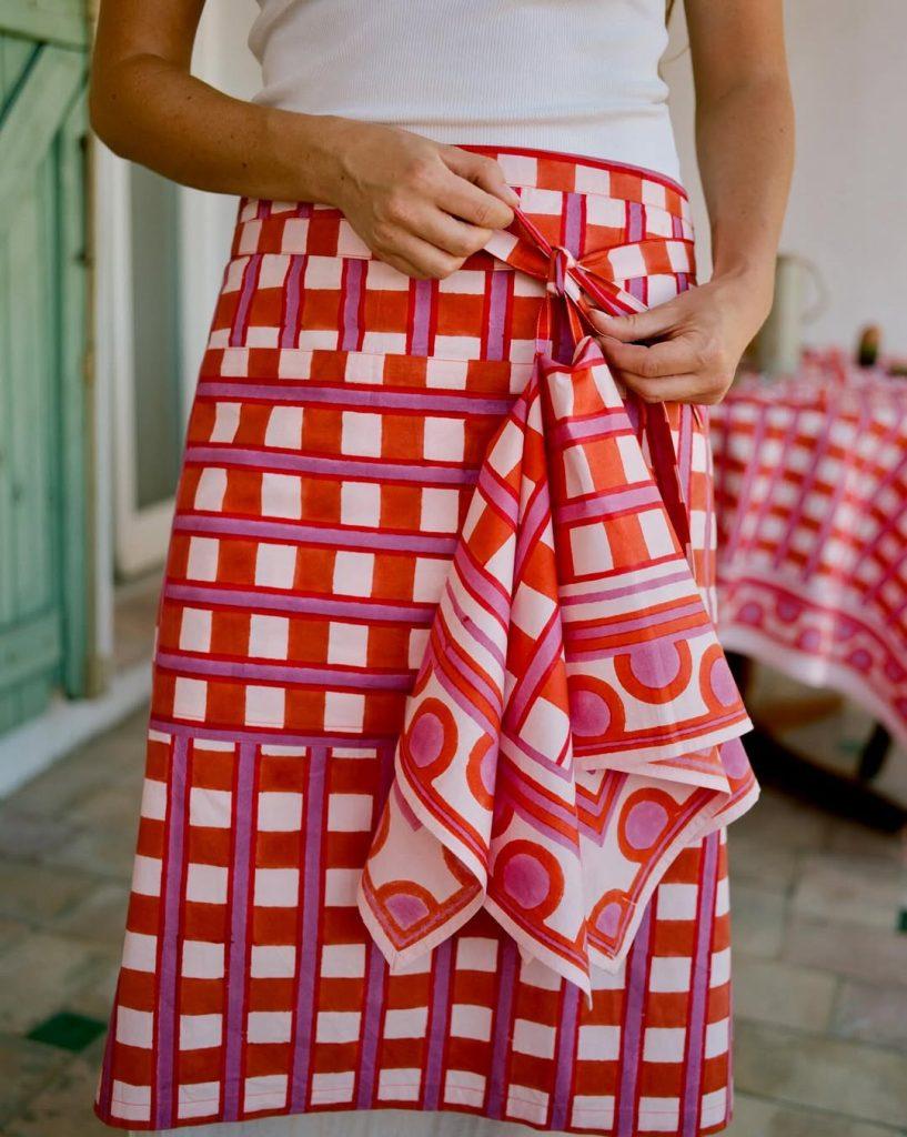 Sui social, la tendenza è ancora di nicchia ma si sta facendo strada. A portarla avanti sono soprattutto i profili di creative e artigiane che si fotografano con il grembiule addosso — non più come protezione, ma come segno distintivo della loro professione. È il caso della chef Alice Moireau o di Candice Margaux Hauss, fondatrice dello Studio Haust, che trasforma una delle sue tovaglie in grembiule: un gesto semplice ma simbolico.