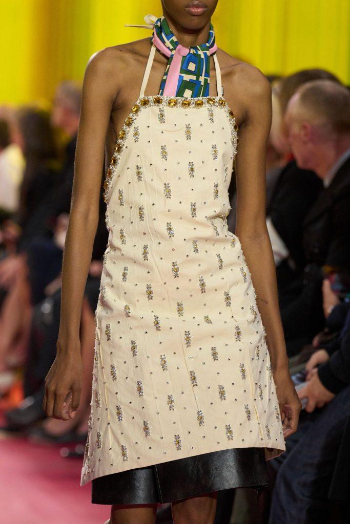 Se fino ad oggi il grembiule era associato ai ristoratori e agli artigiani – cuochi, ceramisti, calzolai o camerieri — Miu Miu decide di reinterpretarlo e quasi sacralizzarlo. La Maison reinterpreta persino il grembiule protettivo in metallo per macellaio, simbolo di protezione e resistenza, e lo impreziosisce con ricami colorati che lasciano intravedere la pelle.