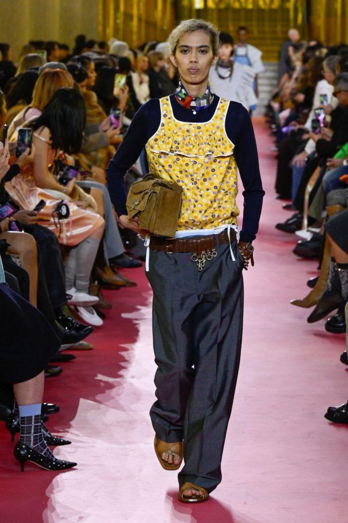 Ma i richiami non si limitano al mondo del lavoro. Chi non ha l’immagine della nonna in cucina con il grembiule a fiori? O della soubrette in pizzo nero, per non parlare della casalinga in vestaglia? Miu Miu riprende tutti questi archetipi e li riscrive. Il grembiule non protegge più dalle macchie: si indossa direttamente sulla pelle, come una tunica rivendicatrice.
