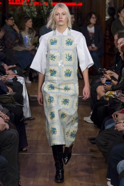 Il ritorno del grembiule e della divisa da lavoro non è un’esclusiva dell’universo di Miuccia Prada. Già prima della Fashion Week di Parigi, altri brand avevano rilanciato in chiave contemporanea questi capi funzionali. A Londra, Ashley Williams li reinventa in chiave pop e girly, accostandoli ad altri elementi dell’estetica da “signora”, come le scarpe ortopediche.