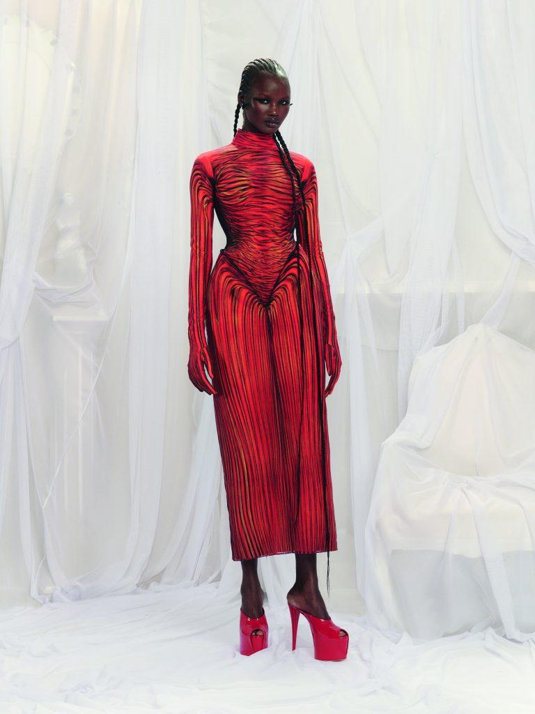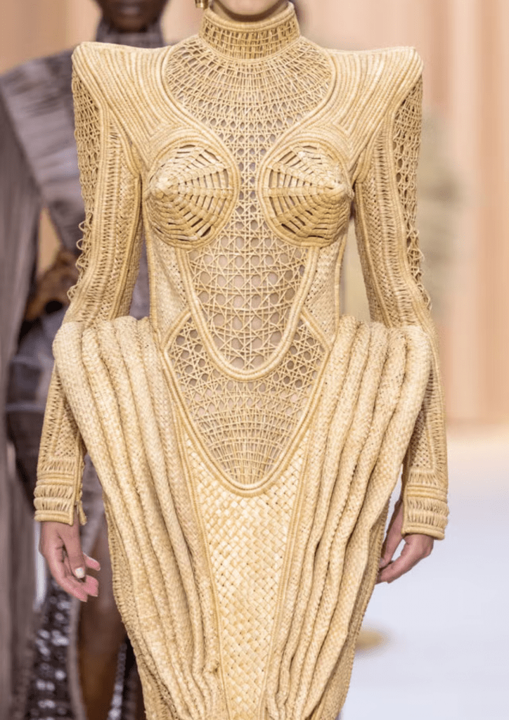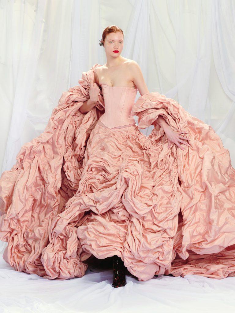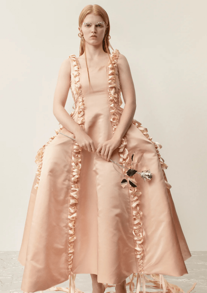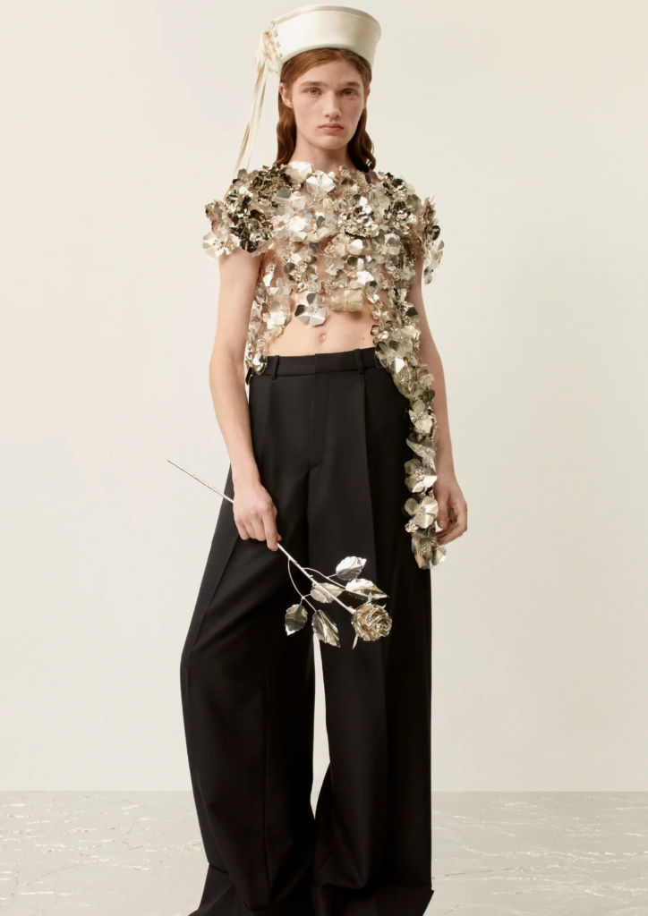 Simone Rocha porta una ventata romantica e gotica nella stagione Primavera/Estate 2024. Tulle, corsetti, pietre preziose e riferimenti liturgici si intrecciano in una palette di colori nude, rosso e nero. La stilista irlandese sfrutta il lato drammatico – in senso teatrale –  delle silhouette di Gaultier, creando abiti avvolgenti come crisalidi, pensati per calcare la scena come i costumi teatrali. Con questa collezione, Simone Rocha esplora la sensualità in modo sottile, quasi sovversivo, proseguendo la sua ricerca personale sulla femminilità. Da sempre grande appassionata di gioielli e accessori, ha messo tutta la sua passione, le sue conoscenze e il suo talento al servizio degli atelier Gaultier, per trasformare ogni abito in un autentico gioiello.