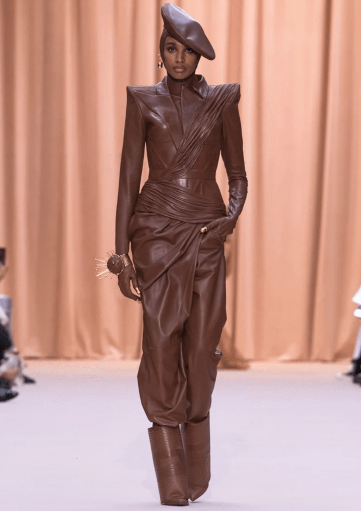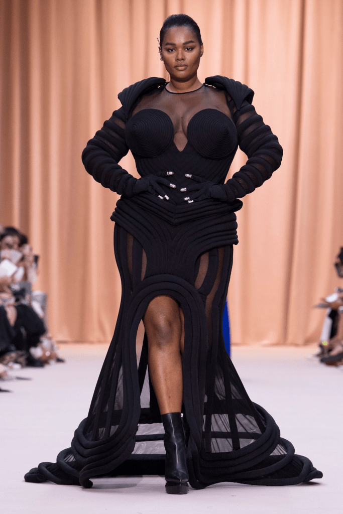 Il terzo invitato dell’“enfant terrible della moda” è il direttore creativo di Balmain. Olivier Rousteing sceglie di rendere omaggio all’uomo Jean Paul Gaultier attraverso la reinterpretazione degli elementi iconici della maison: corsetti conici, abiti profumo “Classique”, marinière XXL. Un omaggio popolare, punteggiato da richiami ai flaconi e agli imballaggi dei profumi Gaultier. E per permettere al pubblico di assistere alla sfilata, è stato persino installato un maxischermo all’esterno della sede della casa di moda. Insomma, una collezione più fedele allo stile Gaultier di quanto lui stesso avrebbe potuto fare, ma sublimemente punteggiata da tocchi Balmain.