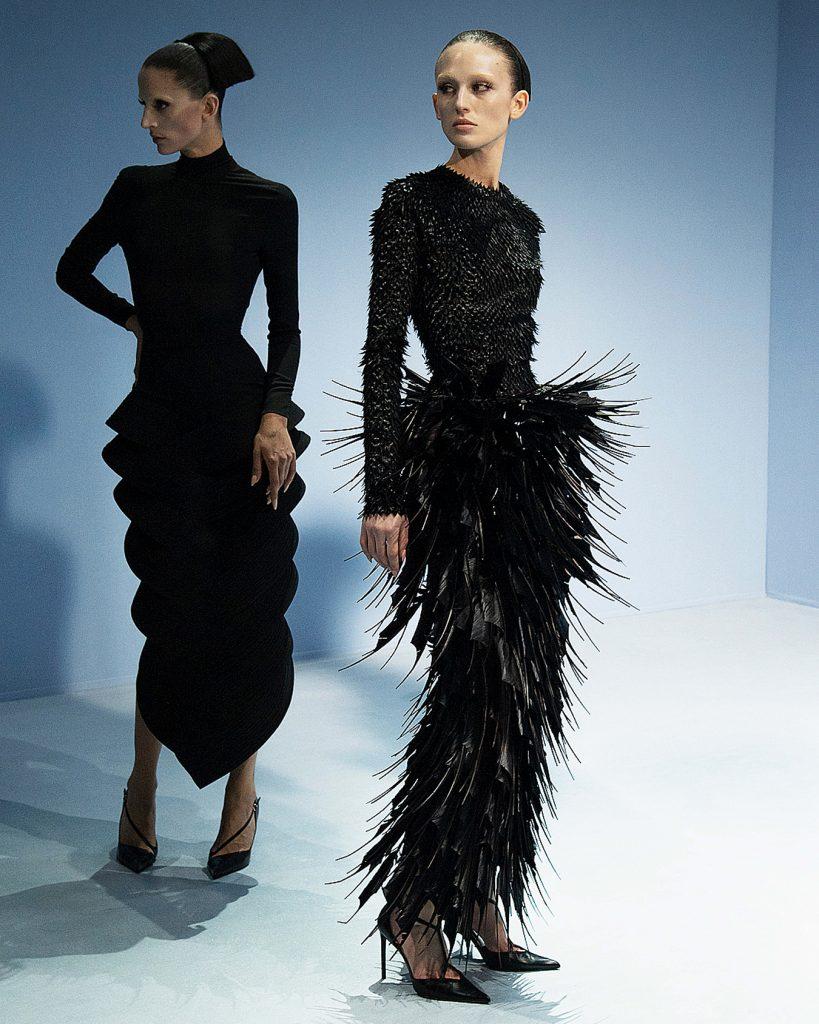 La stagione successiva è Glenn Martens – allora alla guida del compianto marchio Y/Project e oggi direttore creativo di Maison Margiela – a imporre il suo stile con brio. Formatosi all’Accademia delle Belle Arti di Anversa, il belga riprende le celebri illusioni ottiche della maison, i volumi distorti, i trompe-l’œil e i tagli asimmetrici. Un tripudio visivo in cui la triade Gaultier — corsetti, righe e pizzi — si fonde con un approccio avanguardistico alla haute couture. Questa collezione rappresenta anche un ritorno simbolico per Martens, che aveva iniziato la sua carriera stilistica proprio da Gaultier.