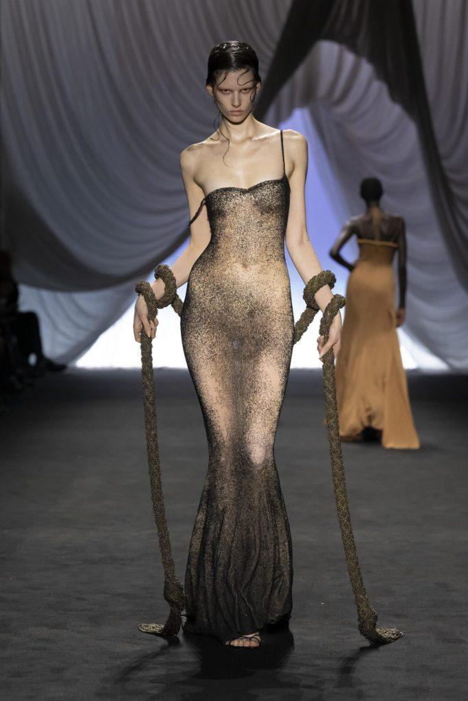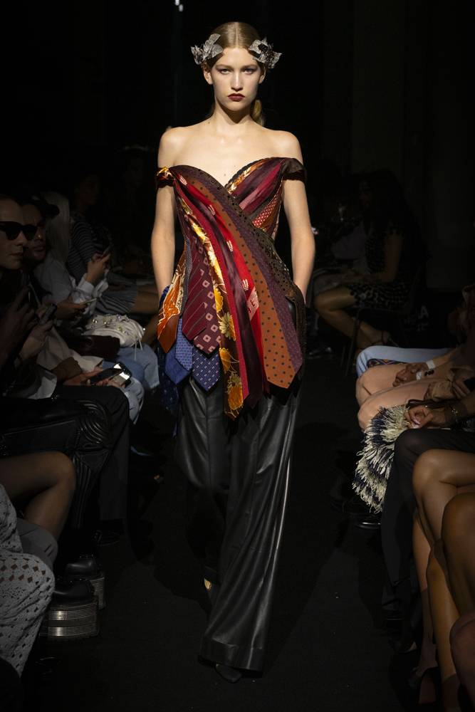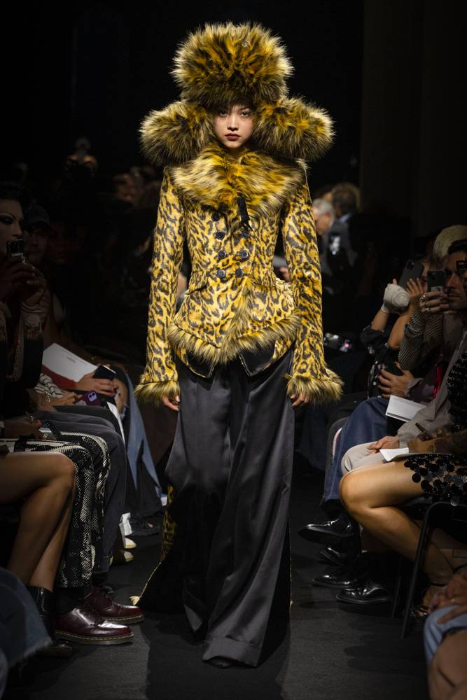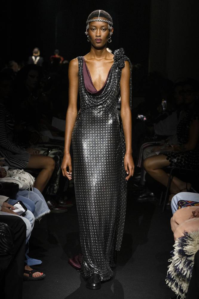 Julien Dossena, direttore creativo di Rabanne, ha concepito la collezione Autunno/Inverno come una passeggiata nelle strade di Parigi, dove ogni silhouette è un personaggio fittizio a se stante. Nessun tema generale, ma frammenti di storie raccontati look dopo look: maglie brillanti in stile Rabanne, tartan alla Gaultier, bustier realizzati con cravatte, stampe animalier a profusione… Dossena orchestra un’epopea sensoriale, una fusione degli universi di Gaultier e Paco Rabanne, con lui nei panni di regista. Una visione spettacolare che ricorda che la moda è, prima di ogni altra cosa, teatro.