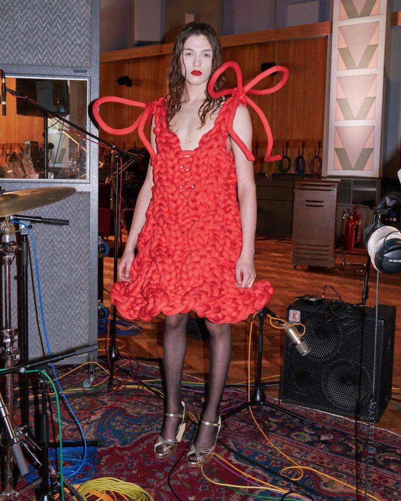 Tartan ai piedi, body painting, stampe all-over, cape lavorati all’uncinetto, camici da infermiere fuori contesto e fiocchi oversize posizionati come segni di punteggiatura visiva. Il risultato è una sinfonia visiva, libera e militante, che richiama l’approccio del “Prepared Piano”: imprevedibile, ma perfettamente orchestrata.