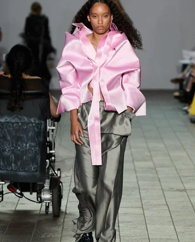 Con un approccio più politico, mariesssschulze rivisita il classico tailleur femminile attraverso il prisma del potere. Dopo un periodo di immersione nel Parlamento tedesco, la stilista stravolge i codici rigidi imposti alle donne in ambito istituzionale. Ne nascono completi in raso dai toni pastello, polsini volutamente esagerati e colletti che si ripiegano all’infinito. Un’eleganza ironica che sfida la standardizzazione e apre la strada a nuove interpretazioni della tenuta “professionale”.