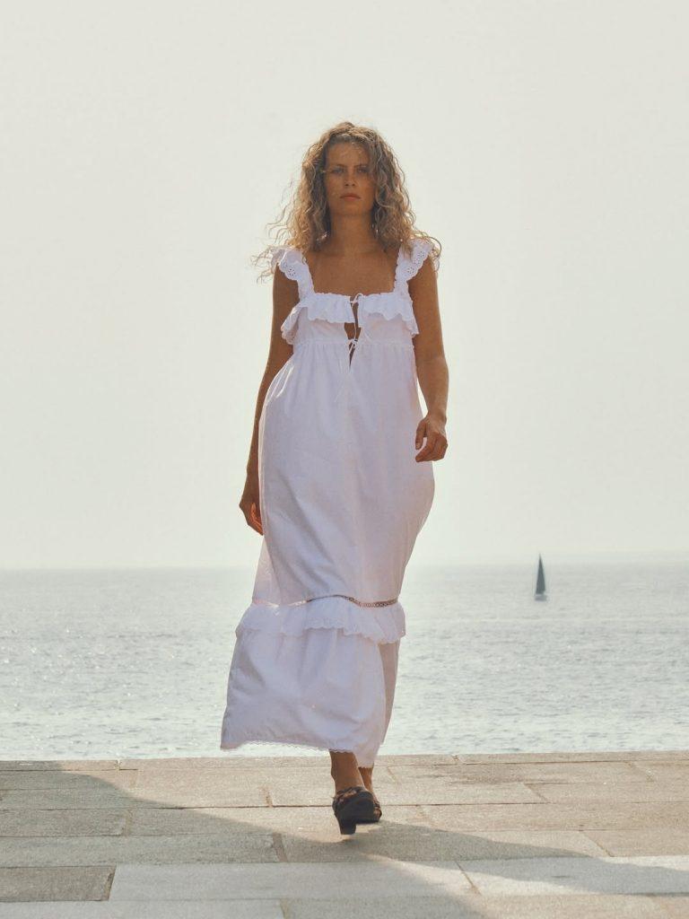 Tra pois (mini o grandi), stampe floreali dal gusto vintage, vichy rétro, lavorazioni all’uncinetto delicate e giochi di trasparenze, La Gâtée propone un guardaroba che profuma d’estate. Volant e colletti curati – dai Claudine bon ton alle scollature più audaci – impreziosiscono abiti corti o bluse, perfetti per passare dal litorale alla città senza dover passare a casa.Tra i pezzi forti: l’abito d’apertura della sfilata con colletto XXL e mix di stampe due-in-uno, un outfit in denim composto da una blusa con ampia scollatura bianca e un pantalone alla caviglia a vita alta con bottoni bianchi, infine, un abito fluido a trapezio, a pois bianchi su fondo rosso, ultra comfort e iper-femminile. Il momento clou dello spettacolo: una sposa velata, seguita da vicino da Marie Dewet, che avanza con un abito bianco panna in stile sottoveste. Un saluto o una sfilata anche per lei?