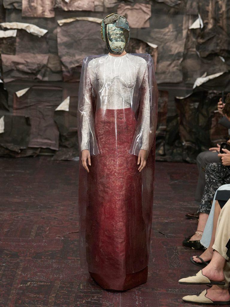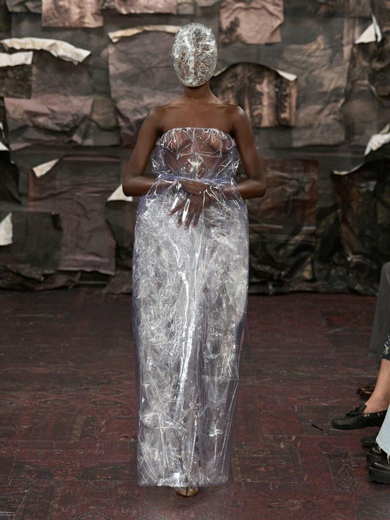 Fin dai primi istanti, le intenzioni sono chiare: le prime tre silhouette sfilano ancora avvolte nella plastica, in attesa di essere rivelate. Sotto il materiale trasparente, domina la trasparenza. L’abito, ancora addormentato, non si mostra: si intuisce. Una metafora della Maison stessa, in piena trasformazione.