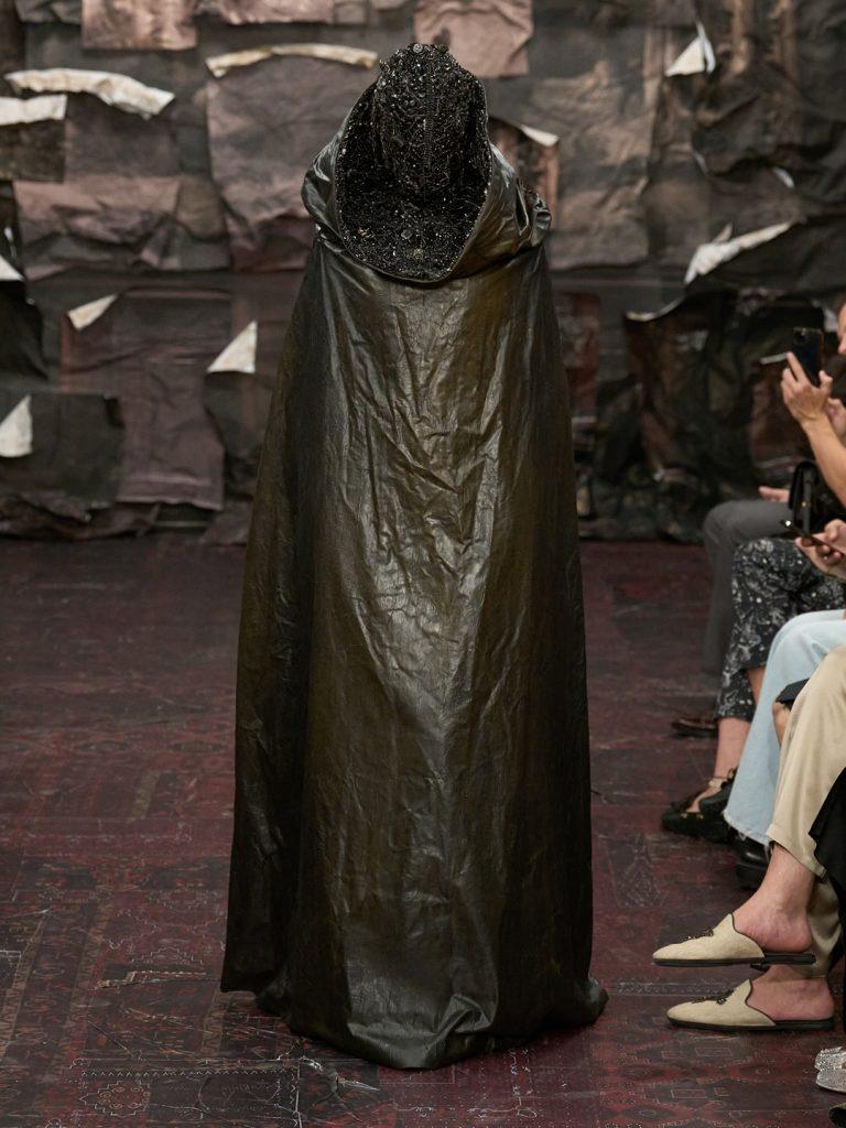 Man mano, le forme prendono vita, i colori emergono, come se ogni uscita rompesse un po’ di più la pellicola protettiva. I capi restano “sigillati”, come se Martens volesse rivelare il proprio mondo poco a poco, con cautela, quasi con pudore. Poi la plastica lascia spazio a drappeggi satinati, i volumi avvolgono i volti.Nelle silhouette 9, 10 e 11 emerge un contrasto sorprendente: le piccole mani degli atelier sono riuscite a ricreare della materia organica. I tagli sembrano realizzati con lo scalpello, con precisione chirurgica, ma il capo vive, respira. Il paradosso si ritrova nei look successivi, ispirati al regno animale: appaiono delle piume su un chiodo di pelle, altrove formano una gonna grigio perla, ariosa e impalpabile. Un completo tempestato di pietre richiama i riflessi cangianti di un pavone.