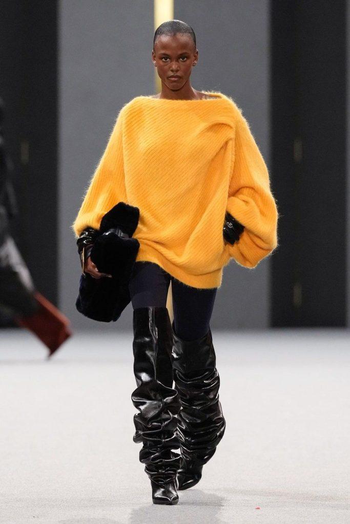 Da Balmain i modelli flirtano con il surrealismo. Gli stivali cuissard sfoggiano un effetto slouchy — materiali morbidi e volumi oversize — equilibrato da un tacco geometrico, sormontato dal logo della Maison. Tutt’altro approccio da Saint Laurent, che reinterpreta in chiave sensuale la slingback con il modello Apolline, un tacco a spillo curvo, quasi sul punto di spezzarsi, che restituisce grinta e modernità a una scarpa considerata ormai classica. Una scelta radicale, ma sempre fedele allo spirito della Maison.