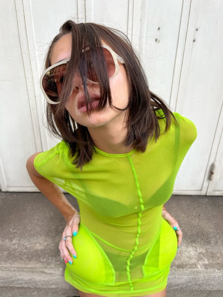 L’emergere dell’espressione “cunti cunta”, coniata da Loeva, cofondatrice dei JUDE Party, sintetizza un nuovo modo di interpretare il neon. Un’attitudine in netto contrasto con la clean girl. Abiti asimmetrici giallo acido, mini-shorts fluo esibiti con orgoglio, costumi da bagno effetto Stabilo, gioielli XXL con un’estetica che sembra uscita direttamente dagli anni ‘80. In questo contesto, il neon non è un semplice dettaglio, ma un mezzo per giocare con i limiti del kitsch e affermare un’identità vistosa e coloratissima.