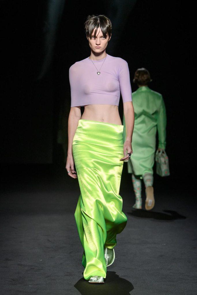 Altri preferiscono adottare il neon in modo più discreto, partendo dalle unghie. Una manicure giallo fluo, una French rosa acceso o un motivo grafico bastano per introdurre un tocco “cunti cunta”. E per chi non teme gli sguardi, il pezzo statement resta l’opzione migliore: una gonna drappeggiata arancio radioattivo, un top seconda pelle verde acido o una parka in nylon blu elettrico nello spirito di Demna da Balenciaga.