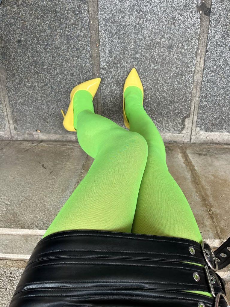 Per chi vorrebbe ma non osa, la soluzione sono i dettagli. Un paio di calzini color lime o un paio di collant dai toni accesi permettono di risvegliare un look in principio sobrio. Il duo di influencer Manon e Lilas inserisce regolarmente tocchi fluo nei propri outfit, soprattutto giocando con la tendenza dei collant a vista.