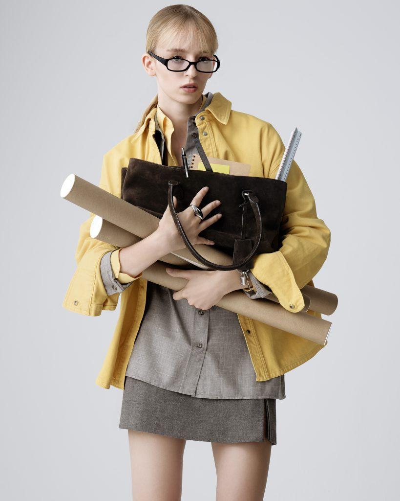 Altro modello rivisitato: la Shell Brot, una sorta di borsa shopping semi-rigida, proposta in un acceso giallo senape, pensata come accessorio statement da mostrare e da portare a mano o sotto il braccio. Tutti i modelli sono disponibili in due formati, per adattarsi alla vita di tutti i giorni senza rinnegare la sua essenza.
