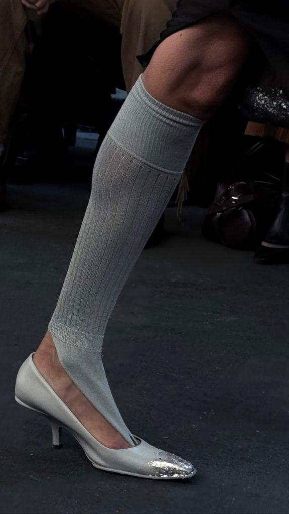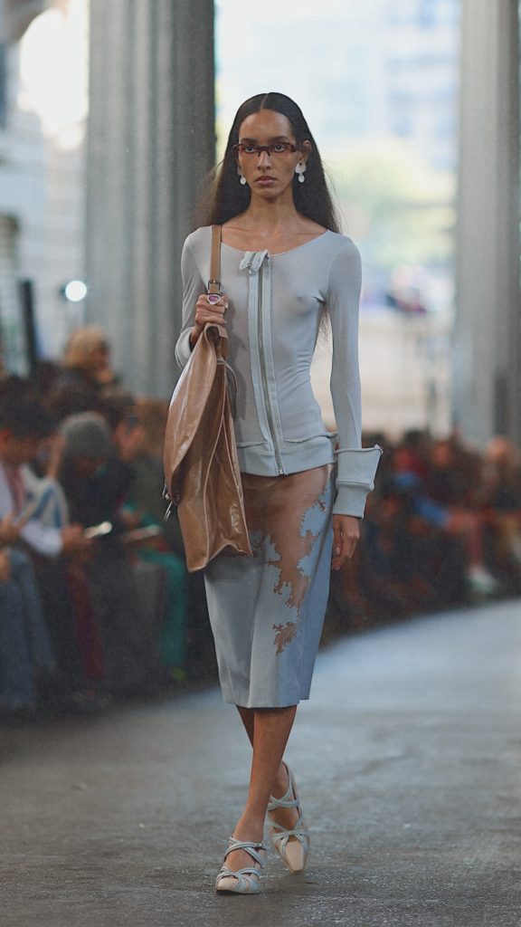 Il nome della collezione « Quick Change » la dice tutta. Le modelle sembrano colte nel pieno dei preparativi: gonne incastrate negli slip, glitter ancora visibili sulla pelle, t-shirt infilate a metà. Alcune si aggiustano il look direttamente in passerella, facendo cadere maniche o spostando gli strati. I reggiseni si indossano sopra le camicie, le borse da lavanderia diventano borse maxi. Un inno all’imperfezione, al gesto interrotto, quasi rubato. Un manifesto volutamente procovatorio nei confronti della « clean girl » e della sua ossessione per il controllo, la grande tendenza di inizio anno.