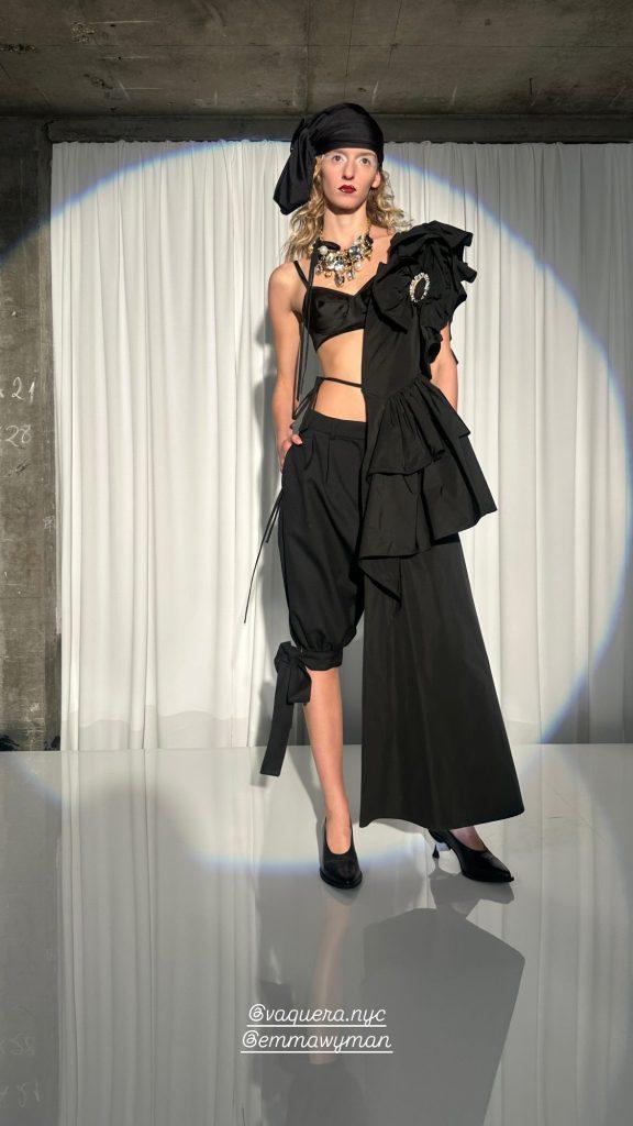 Vaquera, invece, prosegue il suo percorso iperattivo. Dopo la collaborazione con Dsquared2 a Milano e il lancio del profumo « Classique perdu » con Comme des Garçons, il marchio newyorkese ha presentato a Parigi una collezione caos gioioso fatto di mezzi abiti, fiocchi oversize come cinture, collane imponenti di oro, perle e pietre. Una gonna bustier con scollo a barca, maniche a sbuffo e foulard annodato sulla testa chiudono un look a metà tra la party girl anni ‘80 e una piratessa.