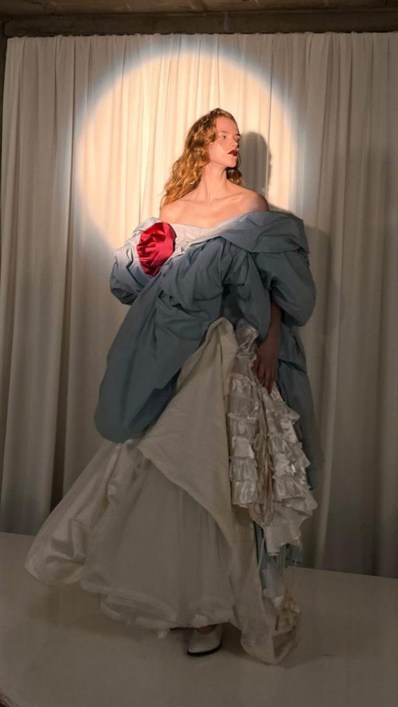I contrasti dominano questa stagione e si accentuano: abiti fluidi e drappeggiati si contendono la scena con con crinoline rigide, a volte lasciate a vista, creando una tensione sottile tra struttura e movimento, tra opacità e trasparenza. Persino il make-up evoca una grandiosità settecentesca. Dietro tutti questi sfarzi e dettagli stilistici, il casting riesce comunque ad attirare l’attenzione: la presenza di Nicky Doll conferma l’energia inclusiva e giocosa, riflettendo la volontà del brand di promuovere un’inclusività più che mai d’attualità nella moda contemporanea.