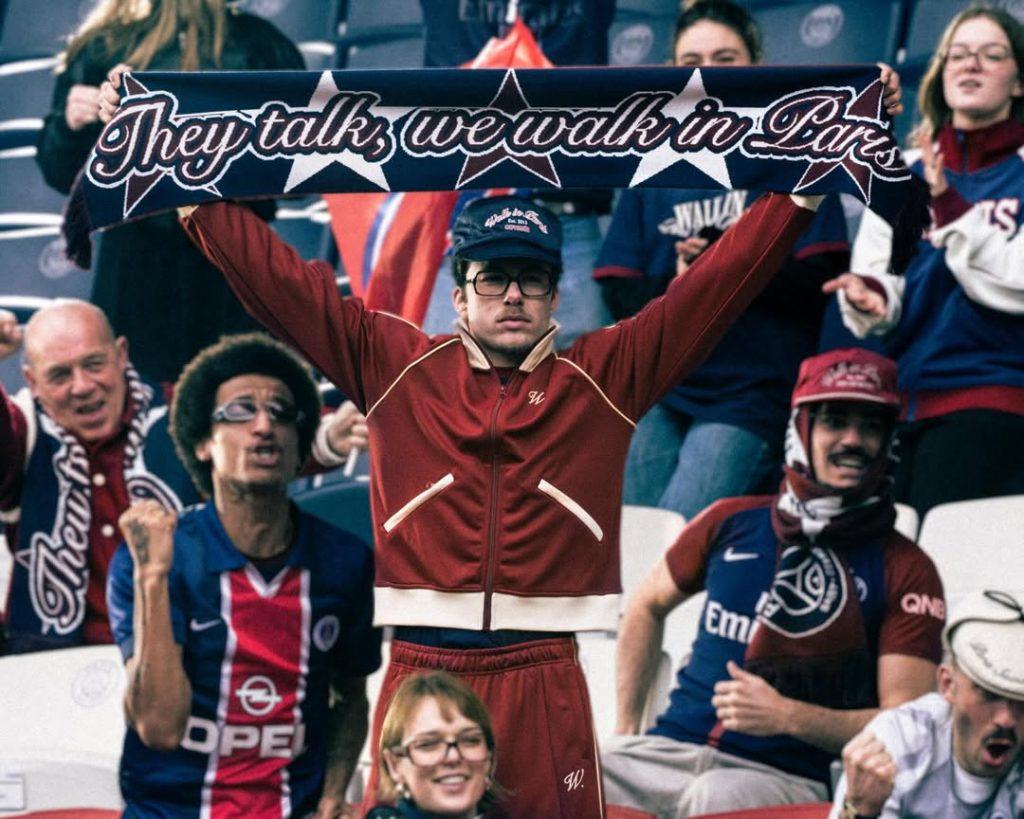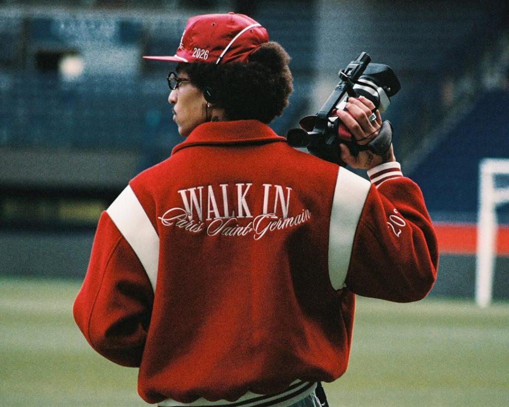 La collaborazione con Walk in Paris sembra una scelta ovvia. La varsity jacket rossa, pezzo iconico dal fascino vintage, dialoga spontaneamente con l’iconografia del club. La campagna, scattata in un Parc des Princes deserto, reinterpreta lo storico slogan adottando la formula “You talk, we walk”.