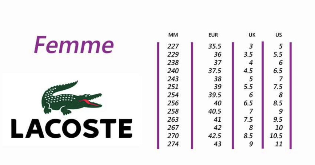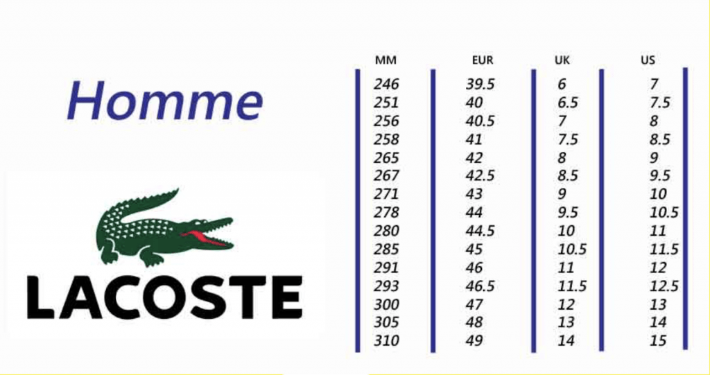 A livello di calzature, Lacoste è rinomata per calzare piccolo, questo vale soprattutto per i modelli più stretti come le Lacoste Carnaby Evo, apprezzate per il loro design minimalista ed elegante. Trattandosi di una silhouette piuttosto longilinea, è consigliabile prendere una mezza taglia o una taglia intera più grande rispetto alla taglia abituale. Stessa cosa per i modelli Lacoste Graduate e Lacoste Lerond, per i quali invitiamo a consultare i commenti degli altri consumatori al fine di determinare la taglia più adatta.