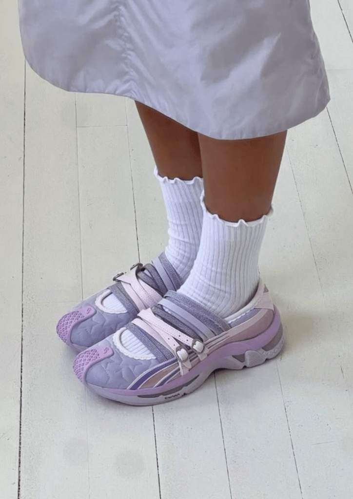 Tra i tanti che stanno reinventando le mitiche ballerine, Cecilie Bahnsen, figura di spicco della tendenza ballet core, ha moltiplicato le collaborazioni con Asics. Sulla scia della stilista danese, una nuova generazione di marchi come Sandy Liang, che ha creato un paio di ballerine sneakers in collaborazione con Salomon, si sta lanciando nella co-creazione di modelli ibridi che ricordano l’emblematica scarpa da danza, con integrate prestazioni tecniche e suole spesse.