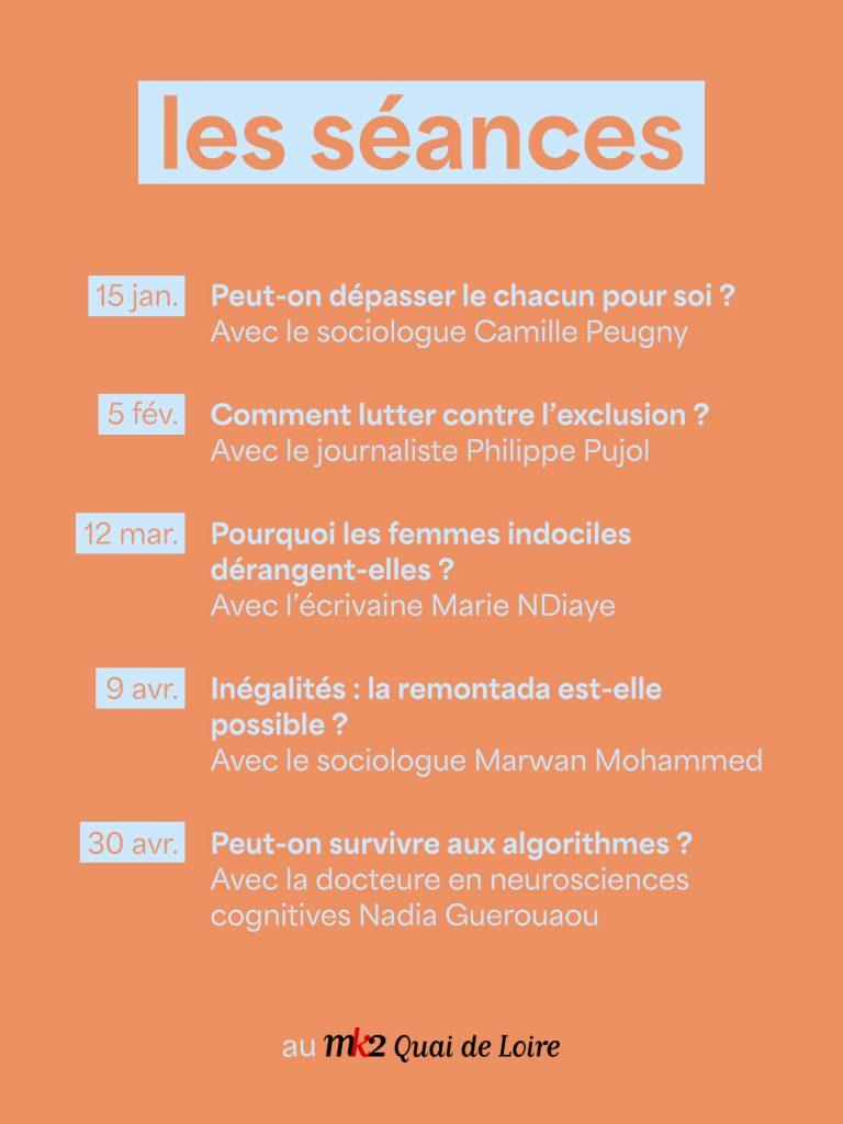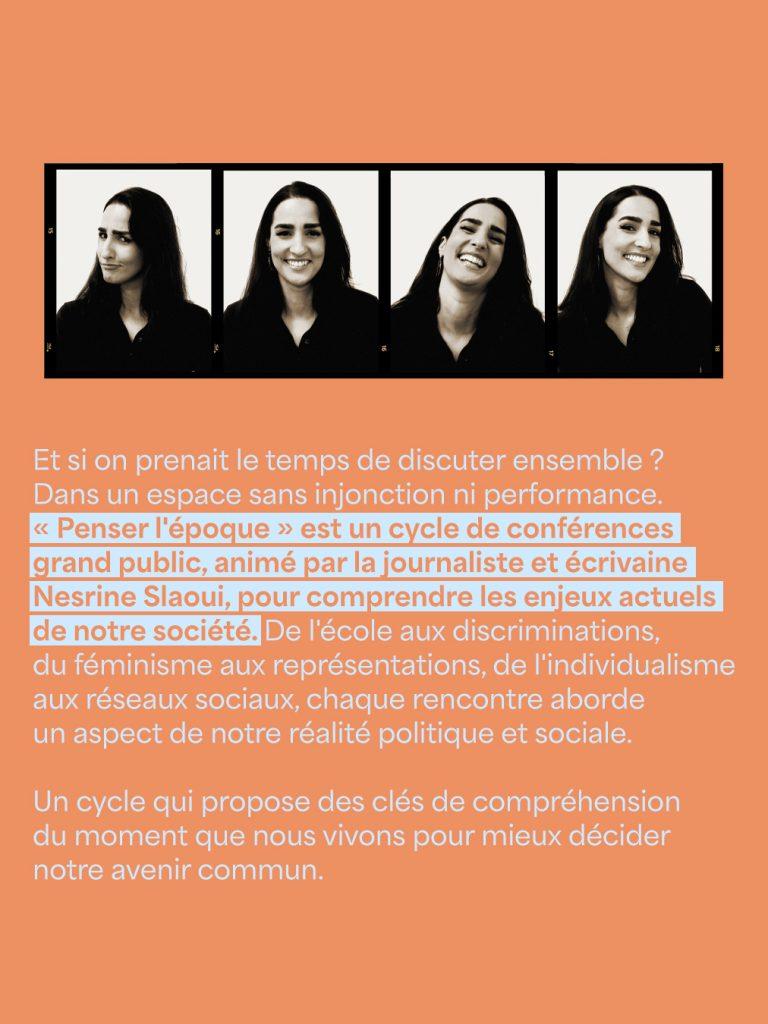 Da diversi anni, la catena MK2 non si limita a proiettare film: attraverso cicli di conferenze su tematiche molto varie, la rete di cinema parigini propone momenti di riflessione collettiva radicati nell’attualità culturale e sociale. Attualmente, la giornalista Nesrine Slaoui anima il ciclo «Penser l’époque» (Pensare l’epoca), offrendo uno spazio di dialogo accessibile e concreto.
